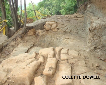 Dowell: I was most excited about studying the tunnel after reading a report sent to us by a geologist who had previously entered and examined the tunnel. However, I was shocked by the discrepancy of the report and definition of the tunnel when I first made way into the entrance. The report was not accurate at all, and by no means were we safe. The tunnel was very small and wet, when you touched many parts of a wall or ceiling, it would start to break away and collapse. There was graffiti and garbage in it, there were no ancient carved monoliths at the entrance of it or at any junction points within. There were a few huge stone slabs with debris collapsing and collecting on them. I removed some of the debris on one stone slab and found a little symbol resembling the letter M. This was the famous stone with the letter ‘E’ and other inscriptions on it. We were told by several scientists who first examined the tunnel with the stone slab, there were no inscriptions on it; they were added on at a later date. The tunnel that was to be the most exciting moment of my journey ended up being the worse experience of my entire stay. I felt very betrayed by previous writings, reports, and the photographs submitted to me to for review.