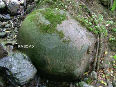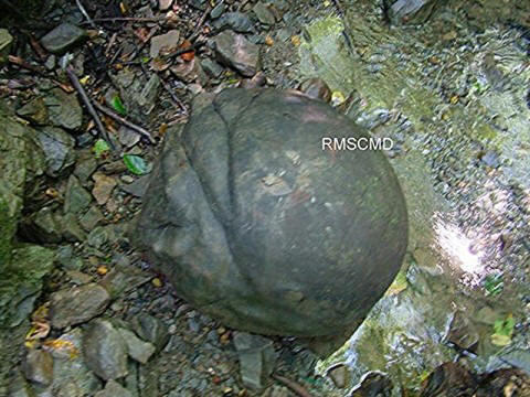 Robert and I trekked the creek and looked at the various stones, there was this one huge one, that is the picture you see with Robert and me standing there and I am filming it……….it was huge, however, it was not a perfect sphere either –none of them were. I asked the young gentleman the story of how the balls were found. This is the story as he was told by his grandfather.