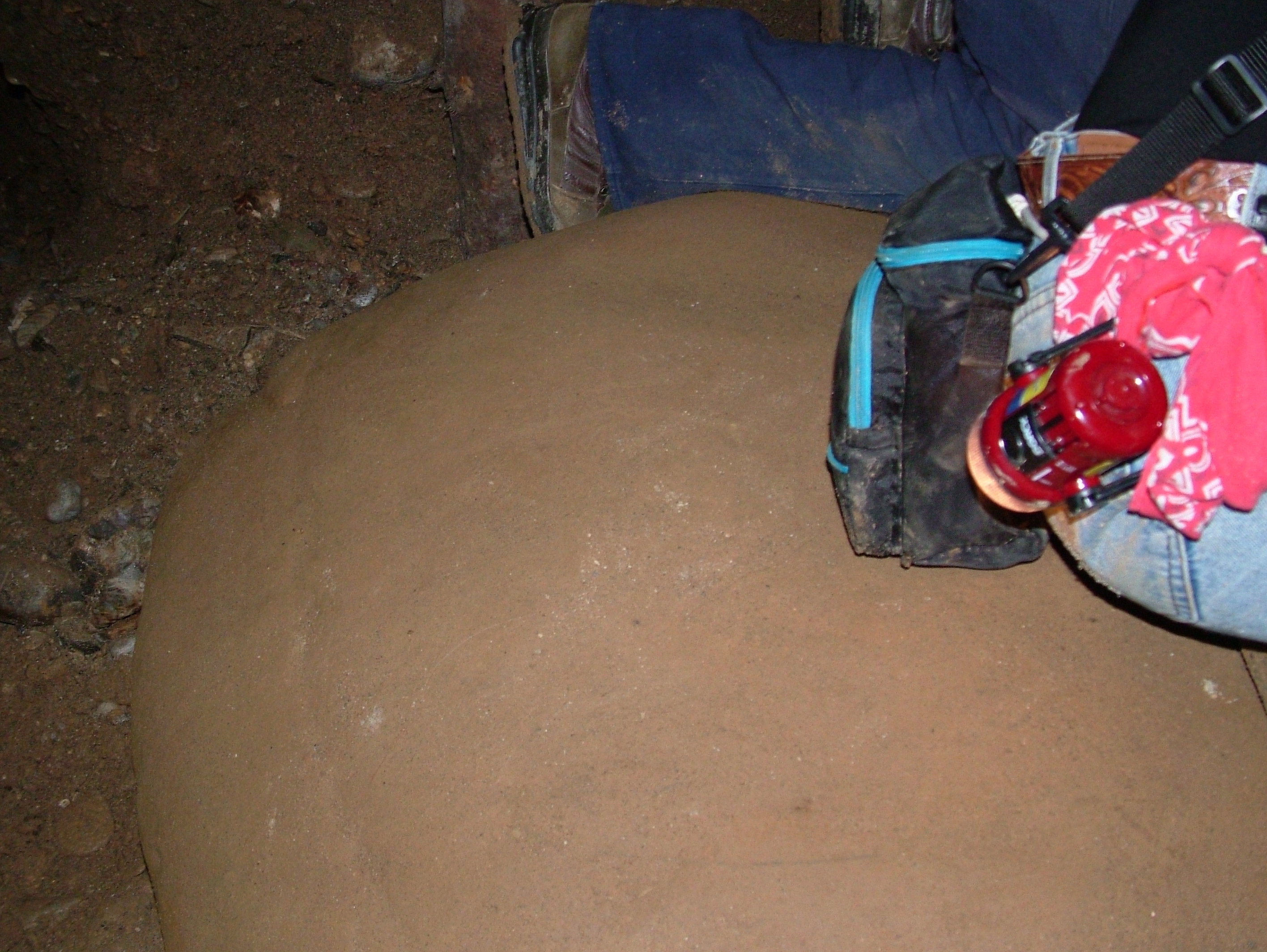 This is the end of the tunnel behind the large slab stone, that is so huge that part of it is still in the picture. I lightened this photograph so the entrance to the far end could be seen. Also, look how big this stone was, it is in every shot, the cavity we were in was very small. The photographs that Muris and Semir provide do not look anything like where this slab ( T2) is located.