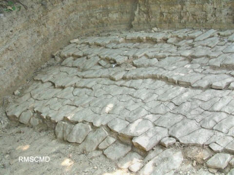 Excavated fossil layer of water current rippled bedrock following angle of strata. Semir claims this layer to be "Man Made" tiles.