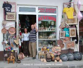 Local store owner on main street in Visoko selling pyramid souvenirs.