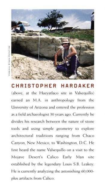 Chris Hardaker was born in Brooklyn, New York to a Brooklyn mother and a WW2 RAF pilot who was born in Mysore, India. When he was nine, his father took the family on a trip to his home in India, and then to Southeast Asia where we visited Bangkok and the Cambodian ruins of Ankor Wat, and ended up in Australia to visit his two brothers. Hardaker got an early view of the world, and supplemented by the constant brainwashing that came from a house full of National Geographics, it was natural that he was attracted to anthropology and archaeology. He has been a New World dirt archaeologist for over thirty years. With a BA from San Diego State University (1976) and a MA from the University of Arizona (1989), he is an explorer of principles that will further archaeological studies and interpretations. His involvement with Valsequillo arose from his investigations of fracture mechanics and stone tool making which cultivated a strong conviction in pre-Clovis horizons in the New World. [[Refs./website]] For the last 15 years he has also explored a fascination with Classical Geometry and its occurrence the world over in the form of symbols and architecture, and focused this newfound tool on the Native Americans of the Southwest and the Chaco Canyon ruins. He is also working to introduce this kind of math to K-12 curriculums.