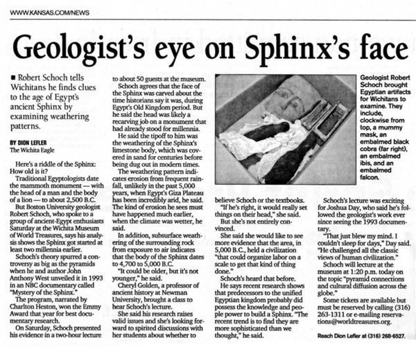 “I spent Saturday & Sunday attending the first of the "Lecture Series" at the Museum of World Treasures (see attachment from Sunday edition of the Eagle). I was surprised that Wichita and the Museum managed to attract the highly prestigious Dr. Robert Schoch and Dr. Colette M. Dowell. Personally, I highly respect and closely follow the studies of these remarkable individuals. For me, the lecture was the greatest thing I've attended in my 15 years in Wichita. Speaking for myself and many others, we were excited to have this opportunity and look forward to, and will continue to attend future Lecture Series Events. The reason I write you, is to recommend Cessna's support for the Museum & the Lecture Series. " Cessna Staff Member